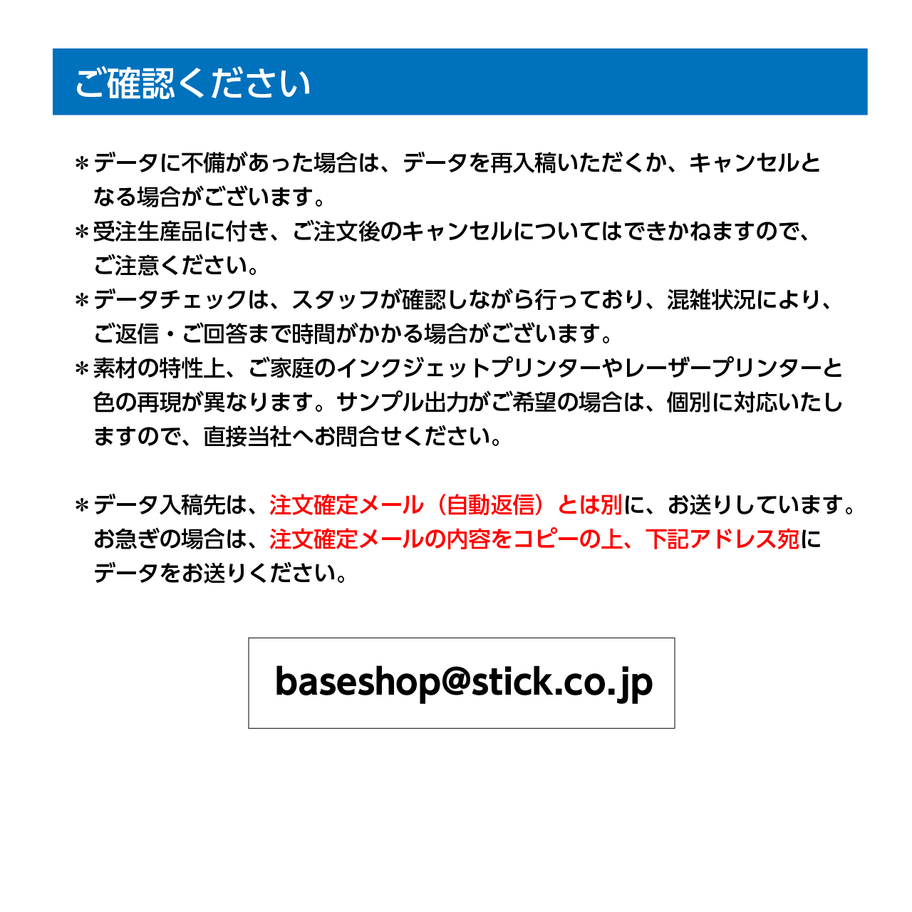 こちらの注文フォームでは、シールの仕上がり面積が60cm2以内のサイズまでご注文をいただけます。それ以外のサイズでご入稿された場合は、サイズを調整の上、再入稿をいただくか、ご注文をキャンセルさせていただく場合がございます。