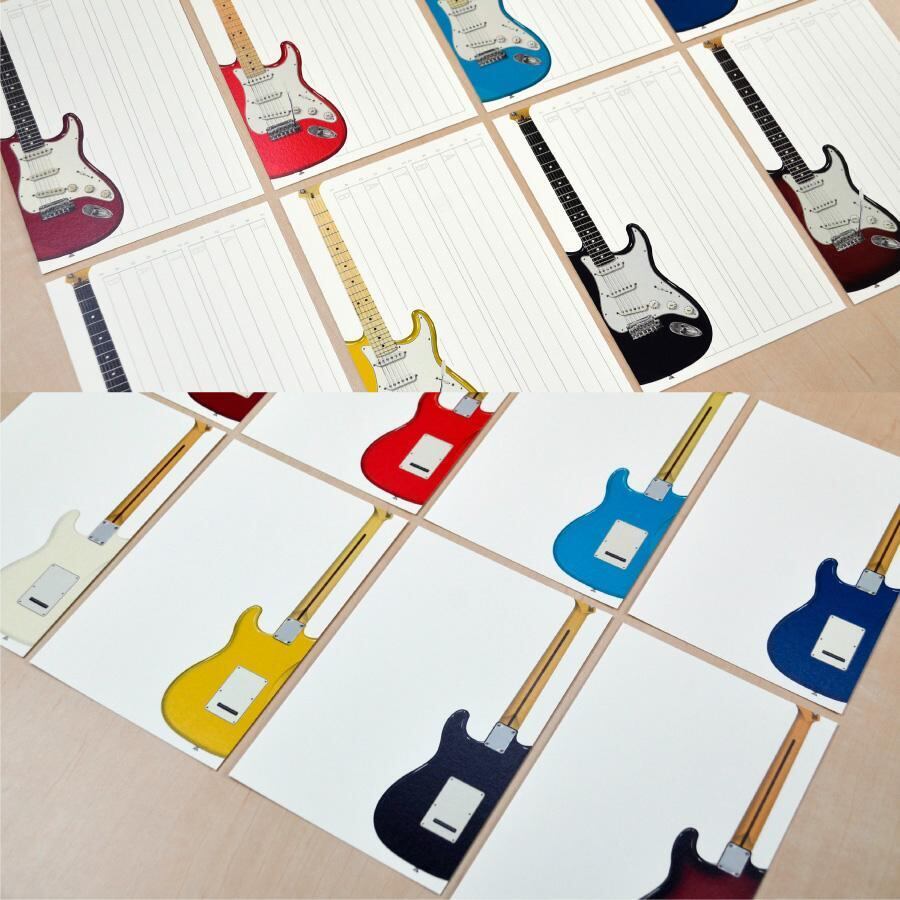 ポストカード(ハガキ)にイラスト化したストラトキャスタータイプ(STタイプ)のエレキギターを配したデザインになっています。ギターの色は8色で、細部を若干変えるなど一本一本こだわって描きました。