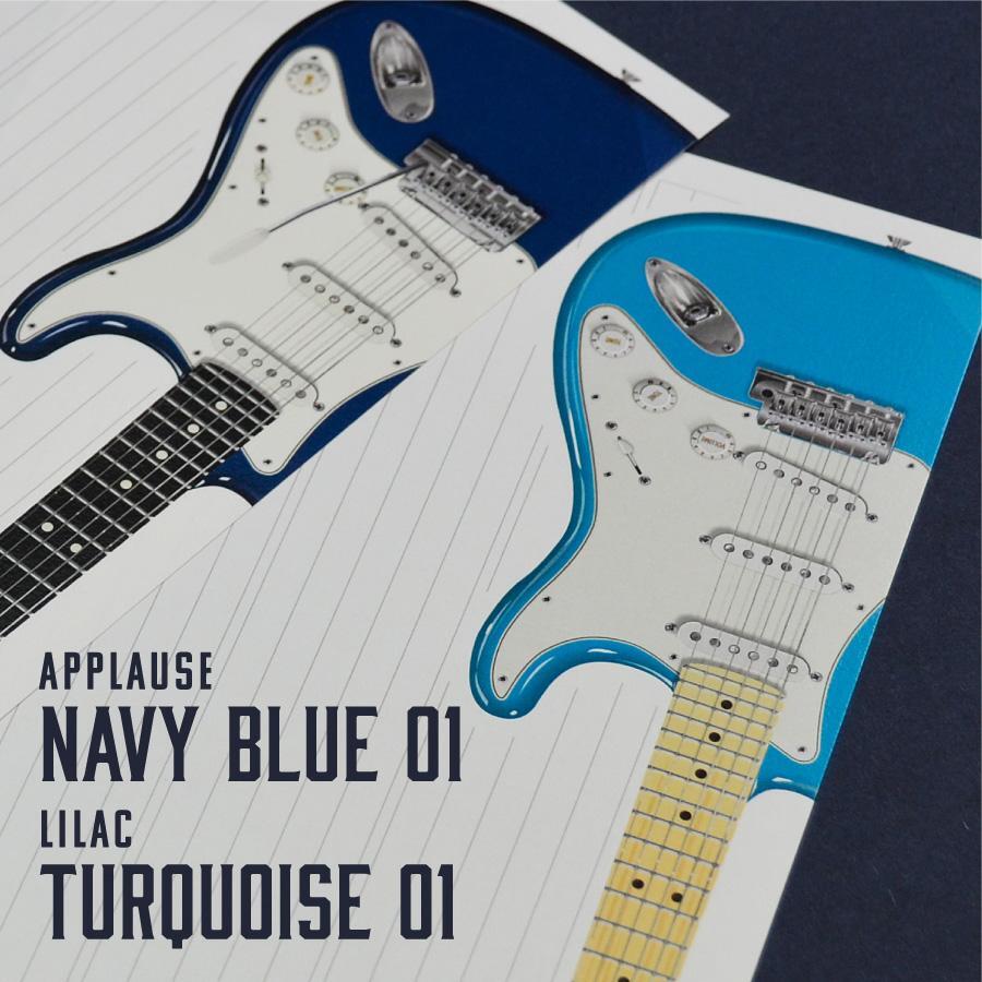 便箋にイラスト化したストラトキャスタータイプ(STタイプ)のエレキギターを配したデザインになっています。ギターの色は8色で、細部を若干変えるなど一本一本こだわって描きました。
